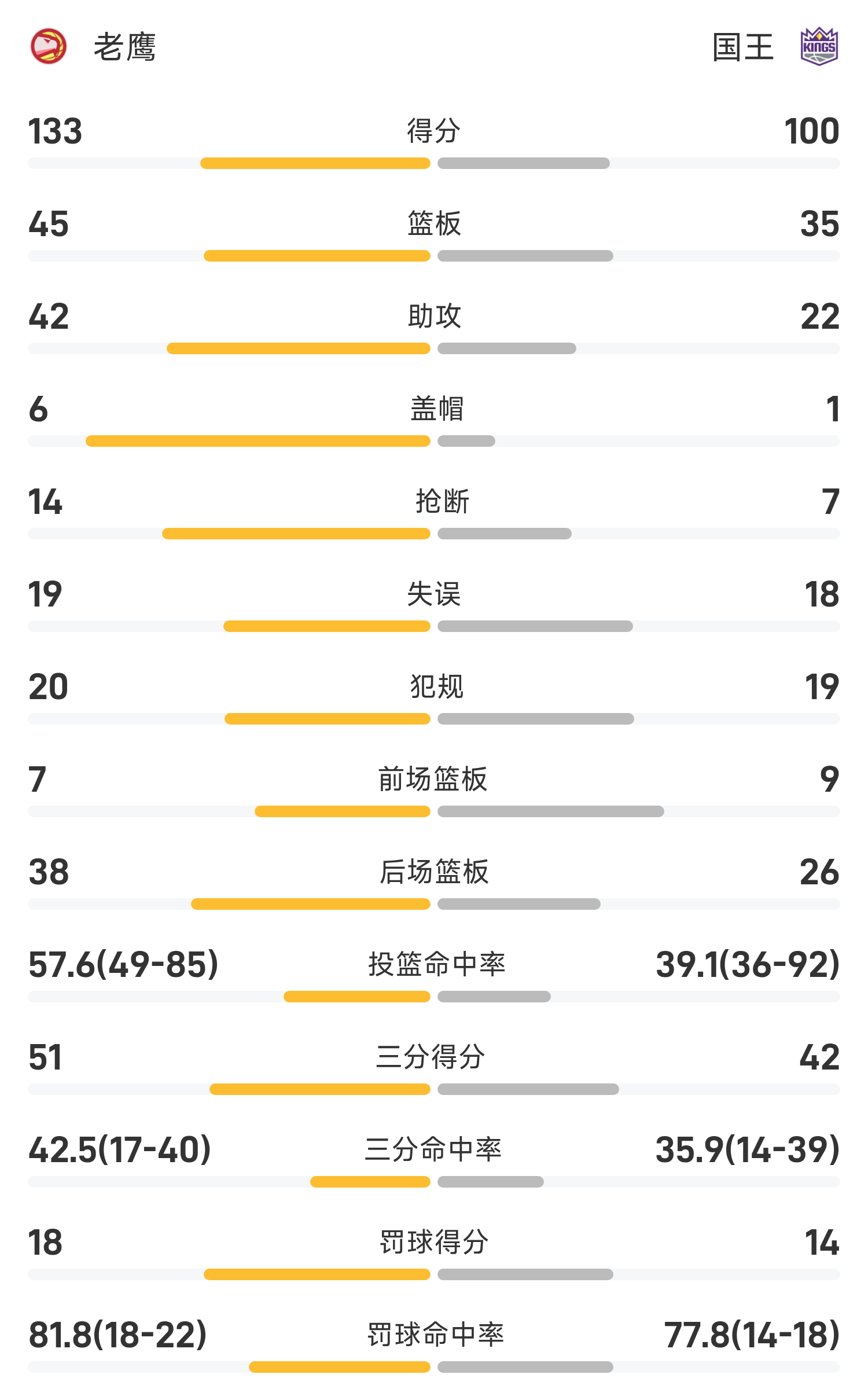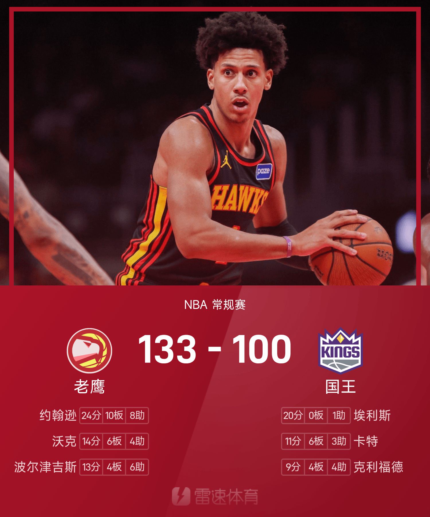 รายงานเกม NBA จอห์นสันมี 24 แต้ม 10 รีบาวด์ 8 แอสซิสต์ ฮอว์กส์เอาชนะคิงส์ 133-100