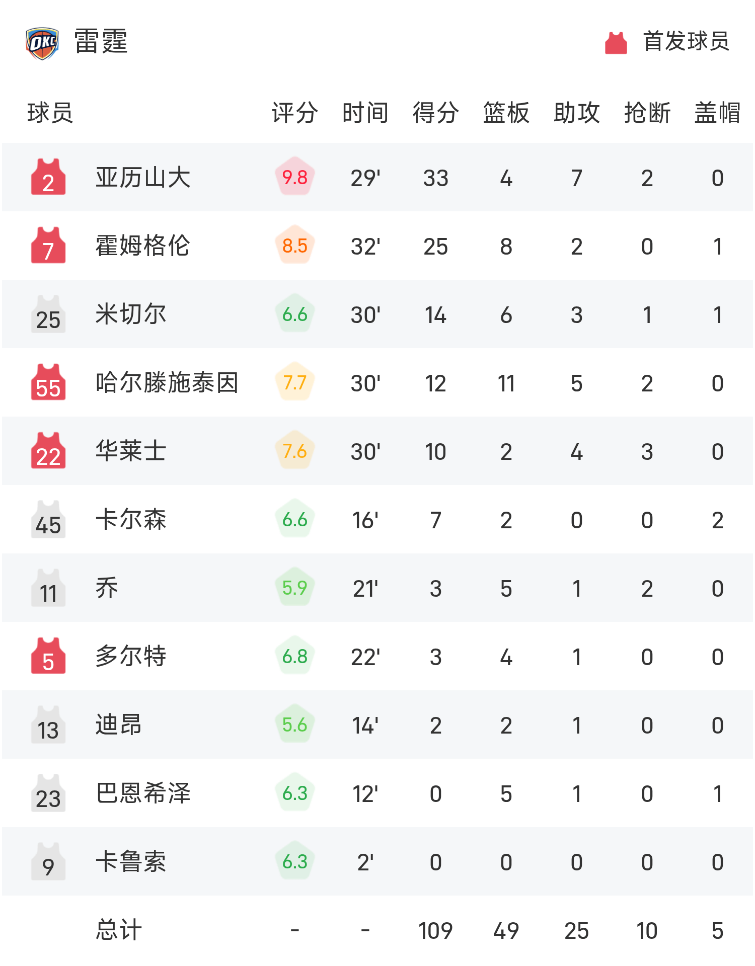 อเล็กซานเดอร์ทำคะแนนสูงสุดในเกม 33 แต้ม 4 รีบาวน์และ 7 แอสซิสต์ นำทีมธันเดอร์คว้าชัยชนะ