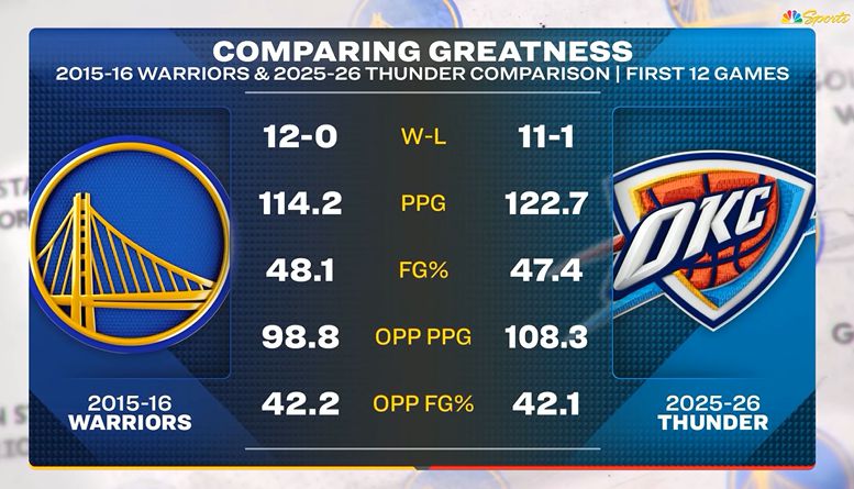 หลังจบเกม สถานีโทรทัศน์ของอเมริกาเปรียบเทียบสถิติของ 12 เกมแรกของ Thunder และ Warriors ฤดูกาลนี้: