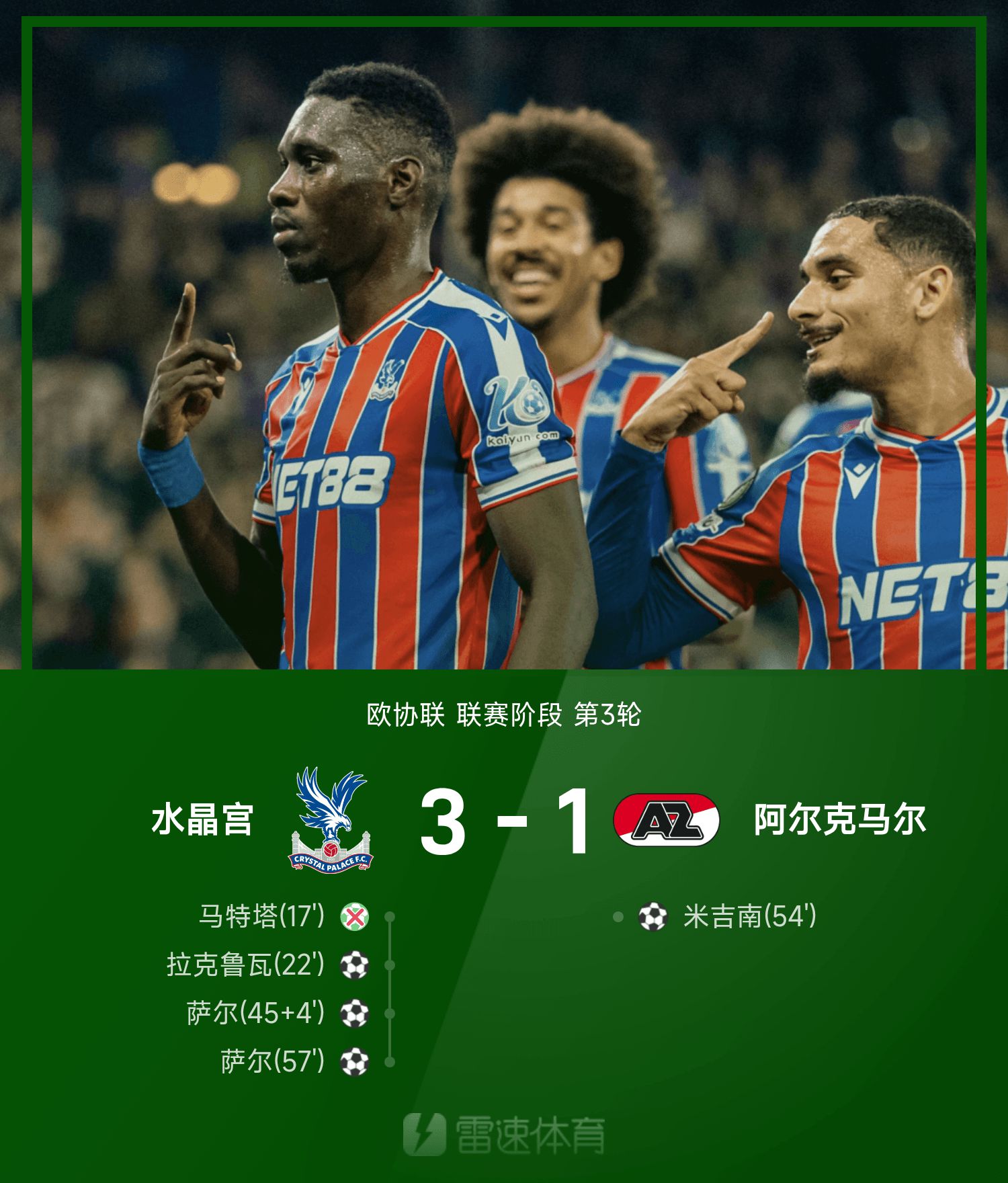รายงานผลการแข่งขันยูฟ่าแชมเปียนส์ลีก : ซาร์ดับเบิ้ล, มัตต้าพลาดแต้ม, คริสตัล พาเลซ 3-1 อัลค์มาร์