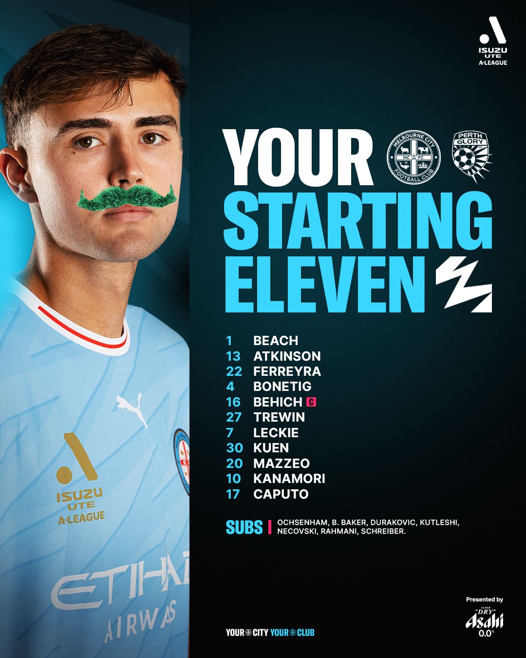 เมลเบิร์น ซิตี้ รายชื่อนักเตะ: 33-โอเซนแฮม, 34-เนคอฟสกี้, 44-คุเทลช์, 39-ดูราโควิช, 19-ชไรเบอร์, 47-รัชมานี่, 38-เบเกอร์