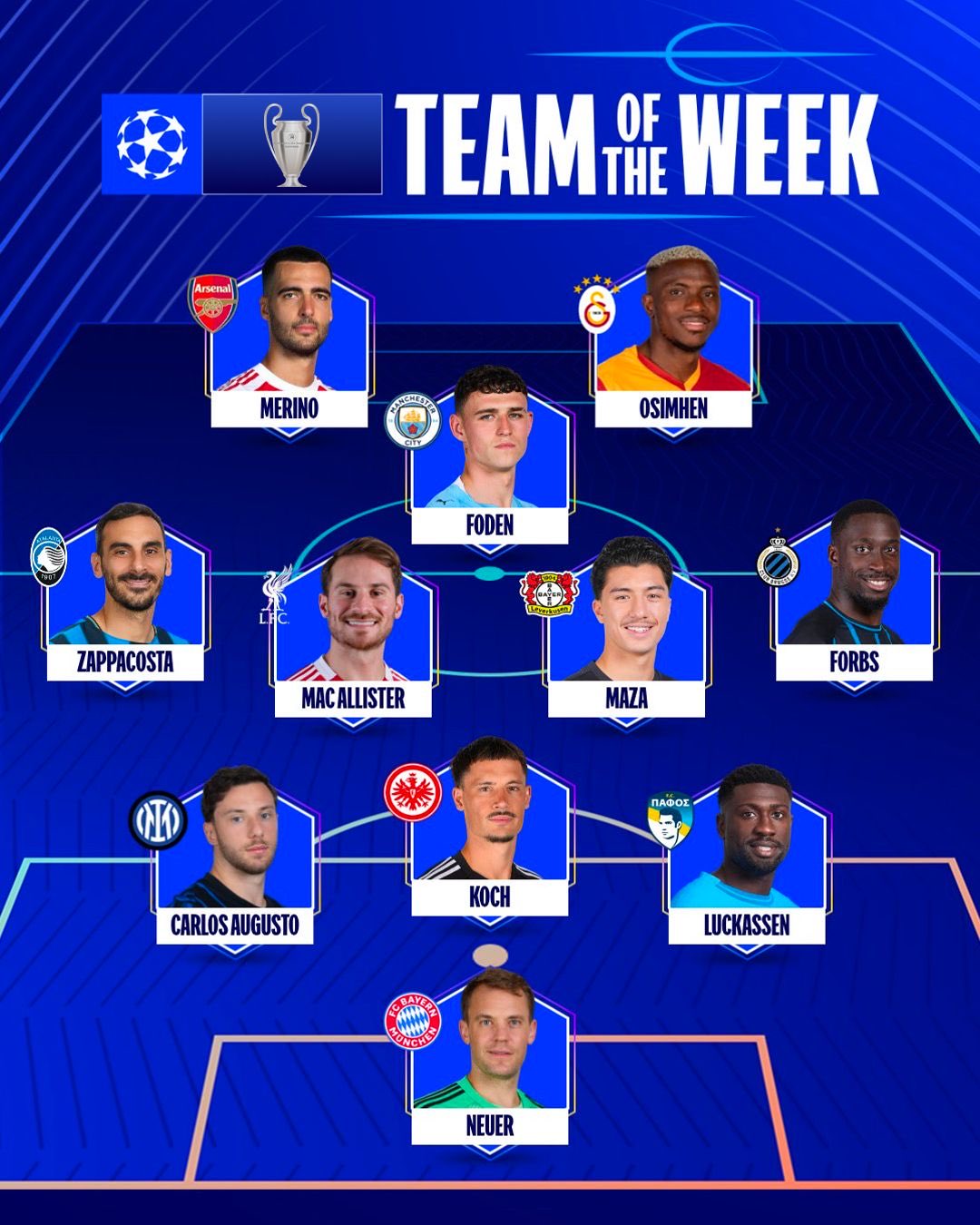 6686 ข่าวกีฬา เมื่อวันที่ 7 พฤศจิกายน ยูฟ่าได้ประกาศทีมยอดเยี่ยมประจำสัปดาห์สำหรับรอบที่สี่ของลีกอย่างเป็นทางการ Osimhen และ Neuer เป็นผู้นำในรายชื่อ โดยมี Foden, McAllister และ Merino รวมอยู่ด้วย