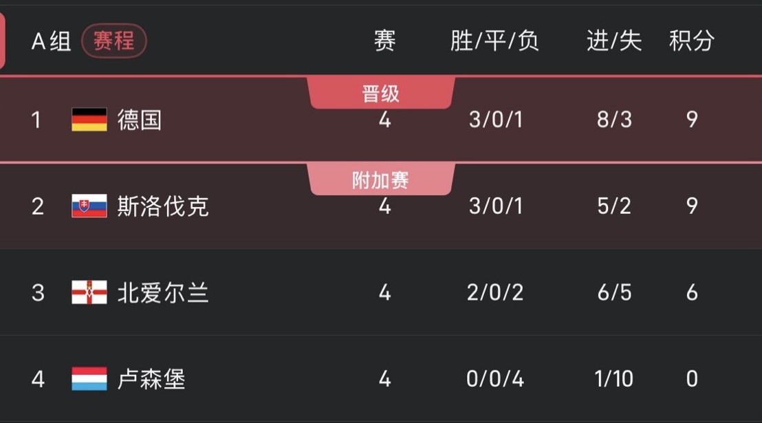 เยอรมนีและสโลวาเกียแบ่งปัน 9 แต้ม และพวกเขาจะพูดคุยกันโดยตรงในรอบสุดท้าย ก่อนหน้านั้นทั้งสองทีมยังต้องเผชิญหน้ากับลักเซมเบิร์กและไอร์แลนด์เหนือตามลำดับ