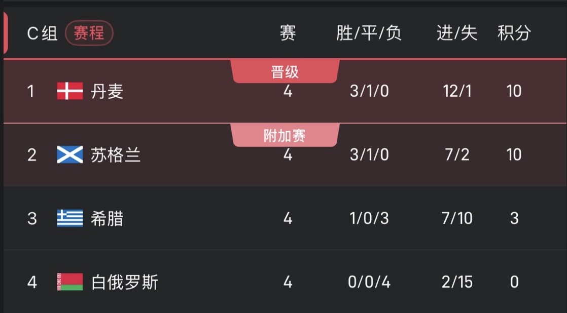 เดนมาร์กและสกอตแลนด์มีคะแนนเท่ากัน ทั้งสองทีมจะแข่งขันกันโดยตรงที่กลาสโกว์ในรอบสุดท้ายเพื่อชิงตำแหน่งสูงสุดในกลุ่ม