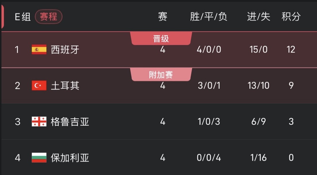 หากสเปนเอาชนะจอร์เจีย และตุรกีล้มเหลวในการเอาชนะบัลแกเรีย ก็จะผ่านเข้ารอบก่อนกำหนด ไม่เช่นนั้นจ่าฝูงของกลุ่มน่าจะถูกตัดสินในรอบสุดท้ายของการเจรจาโดยตรงระหว่างสเปนกับตุรกี