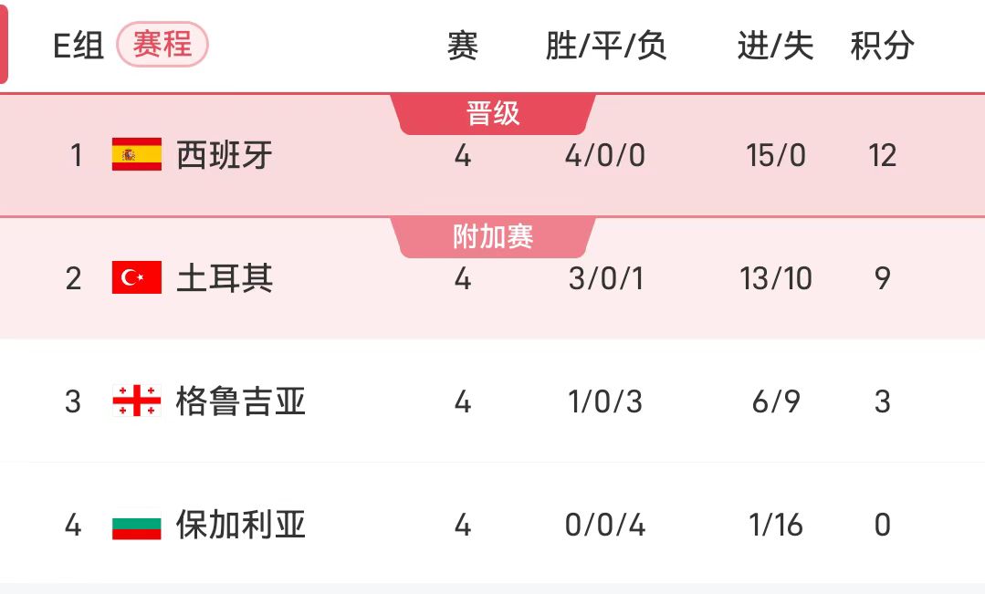 ในการแข่งขันกลุ่ม E ครั้งต่อไป สเปนจะพบกับจอร์เจีย และตุรกีจะเผชิญหน้ากับจอร์เจีย สเปนซึ่งปัจจุบันนำอยู่ 3 แต้ม จะผ่านเข้ารอบสหรัฐอเมริกา แคนาดา และเม็กซิโก 1 รอบก่อนกำหนด หากชนะรอบนี้ และตุรกีไม่ได้คะแนนทั้งสามแต้ม