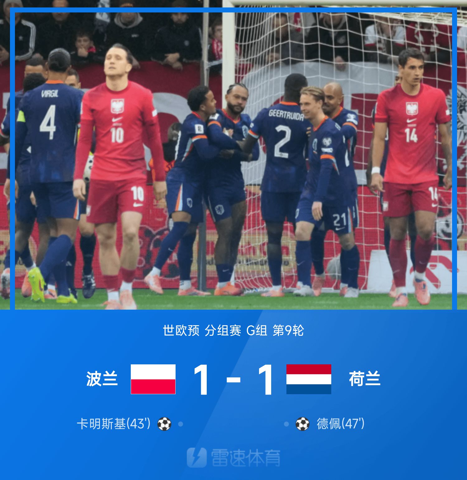 6686 ข่าวกีฬาวันที่ 15 พฤศจิกายน ในรอบที่ 9 ของกลุ่ม G ของรอบคัดเลือกโลกยุโรปครั้งที่ 26 โปแลนด์เผชิญหน้ากับเนเธอร์แลนด์ ครึ่งแรกเกมยังน่าเบื่อจนถึงนาทีที่ 43 เมื่อเลวานดอฟสกี้จ่ายบอลจังหวะสองให้คามินสกี้บุกเตะมุมไกลและทำประตูได้ โปแลนด์เข้าสู่ช่วงพักครึ่งโดยได้ประตูขึ้นนำ ต้นครึ่งหลัง เดปาย ยิงตีเสมอด้วยการยิงลูกกวาดในระยะประชิดในโซนสามวินาที ตั้งแต่นั้นมาทั้งสองฝ่ายไม่สามารถปรับปรุงสกอร์ได้ และเนเธอร์แลนด์เสมอกับโปแลนด์ 1-1 ในเกมเยือน ปัจจุบันเนเธอร์แลนด์นำโปแลนด์ 3 แต้มและมีผลต่าง 13 ประตู โดยพื้นฐานแล้วล็อคอยู่ในจุดที่นำไปสู่ฟุตบอลโลกโดยตรงในสหรัฐอเมริกา แคนาดา และเม็กซิโก