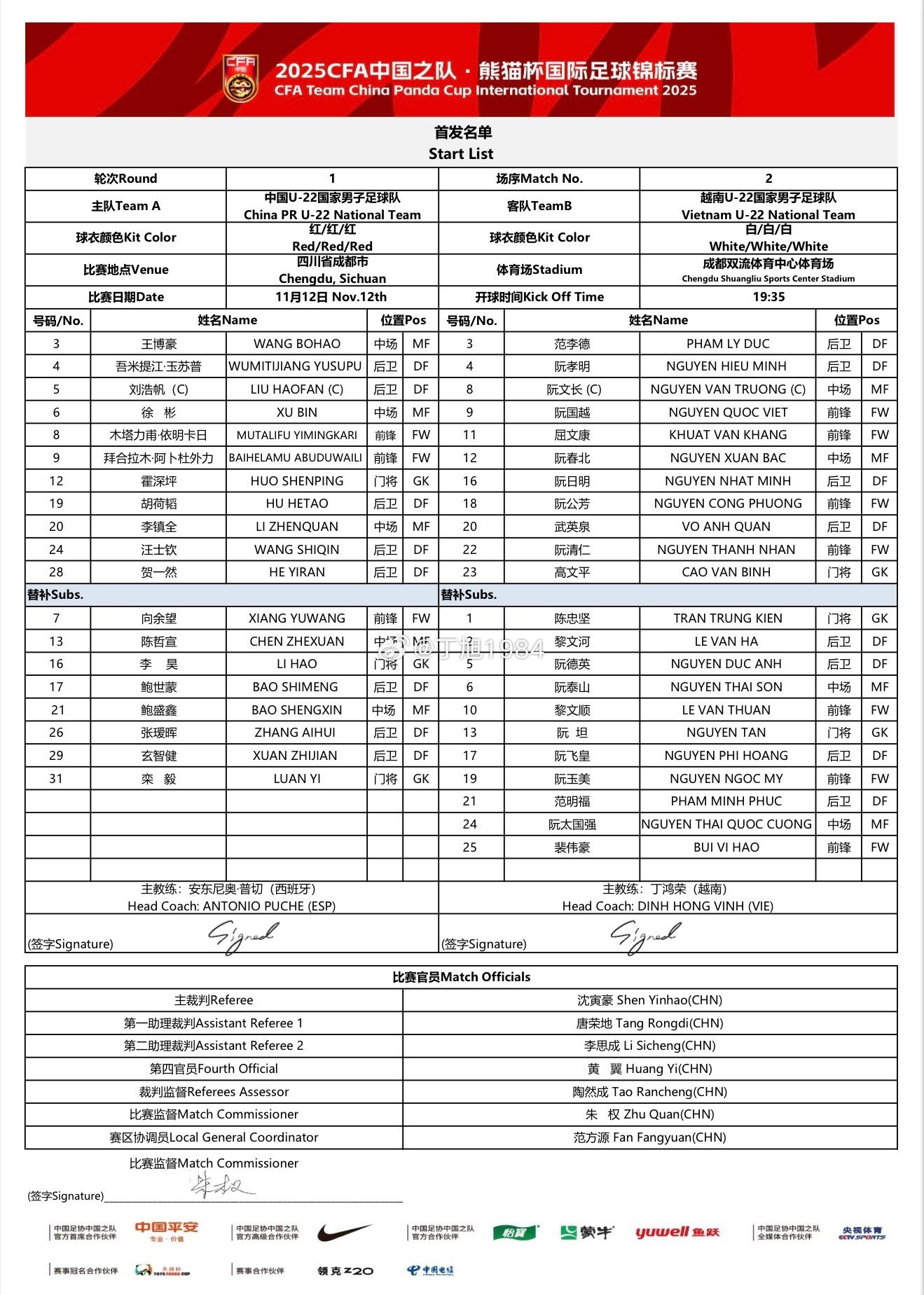 เวียดนาม U22 รายชื่อตัวจริง:16-เหงียน นัท มินห์, 4-เหงียน เสี่ยว มินห์, 8-เหงียน เหวิน ชาง, 18-เหงียน กงฟาง, 22-เหงียน ทันห์ เญิน, 23-เกา เหวินผิง, 3-ฟ่าน ลี เต๋อ, 9-Nguyen Guoyue, 20-Vu Ying Quan, 11-Qu Wen Kang, 12-Nguyen Chun North