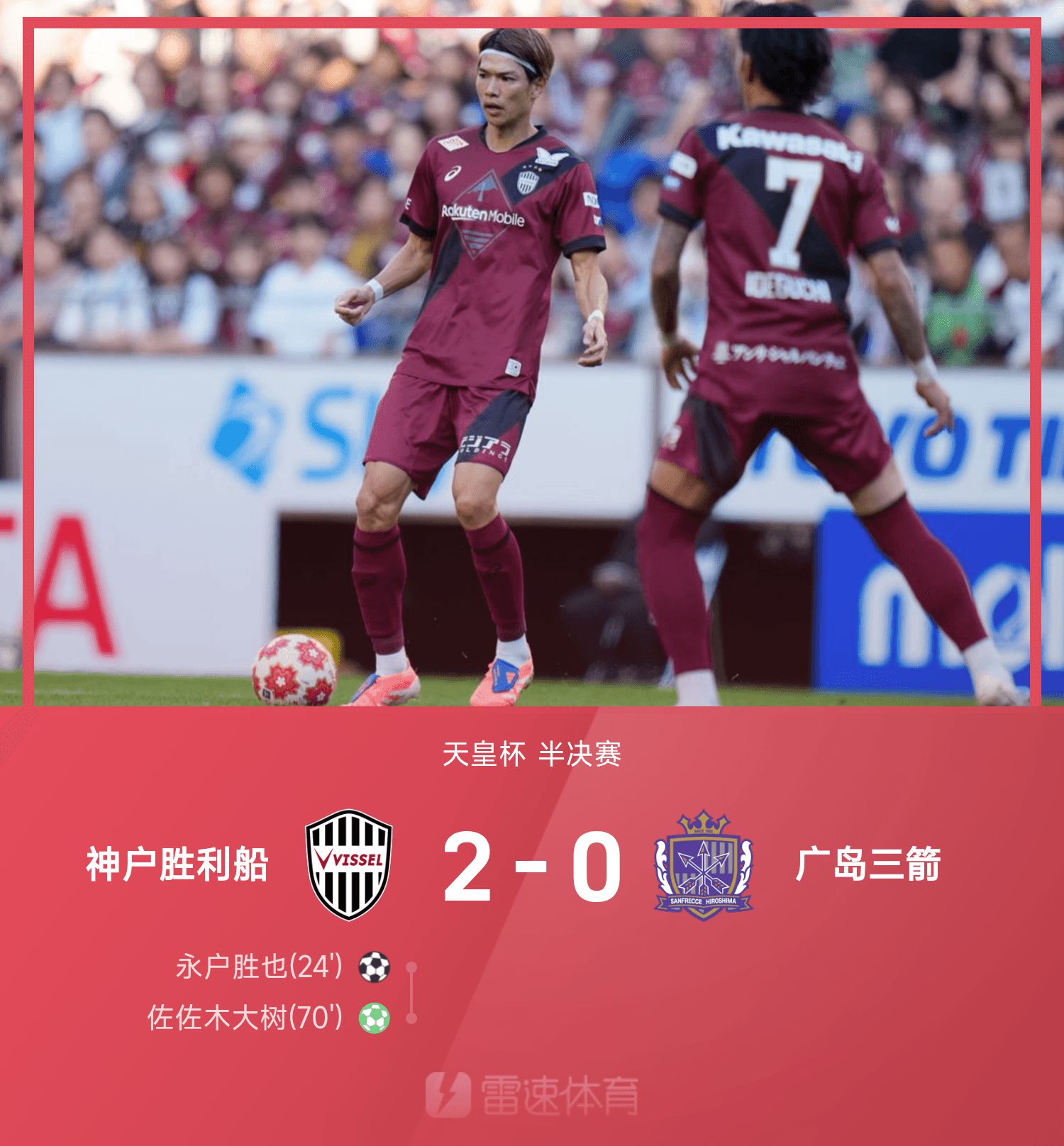 6686 Sports รายงานเมื่อวันที่ 16 พฤศจิกายนว่าในรอบรองชนะเลิศเอ็มเพอเรอร์คัพครั้งที่ 25 โคเบะคว้าชัยชนะเหนือซานเฟรซเซ ฮิโรชิม่า 2-0 ครึ่งแรก คัตสึยะ นากาเบะ ยิงจากนอกช่วยให้โกเบเปิดสกอร์ได้ เปลี่ยนข้างสู้ใหม่ อิซามุ โอซาโกะ ยิงจุดโทษ 12 หลาเซฟไว้ได้ อย่างไรก็ตาม ผู้รักษาประตู ฮิโรชิม่า ซานเฟรซเซ เคลื่อนตัวไปข้างหน้าและถูกลงโทษอย่างรุนแรง ในท้ายที่สุด ไดกิ ซาซากิ ยิงแต้มช่วยให้โคเบะชนะและผนึกชัยชนะ และเข้าสู่รอบชิงชนะเลิศถ้วยจักรพรรดิเป็นเวลาสองปีติดต่อกัน
