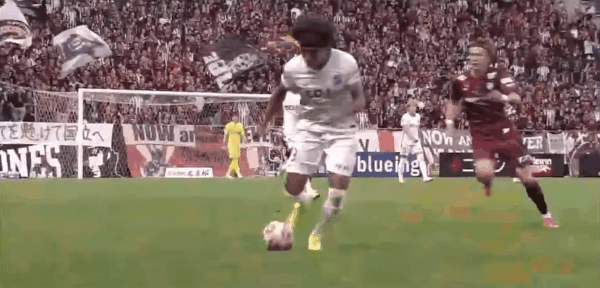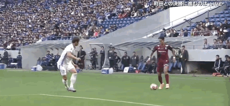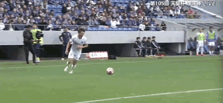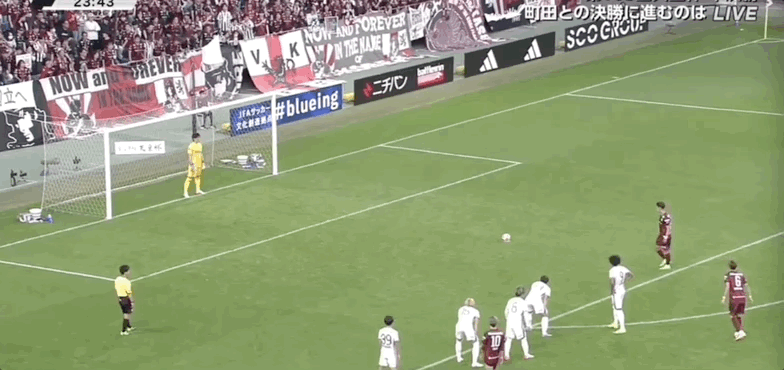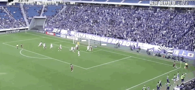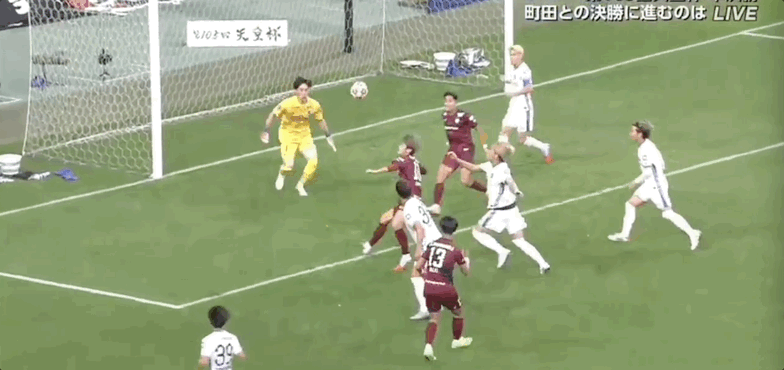 12' คิโนชิตะ โคสุเกะโหม่งบอลในโซนสามวินาที แล้วบอลหลุดออกจาก ขอบเขต