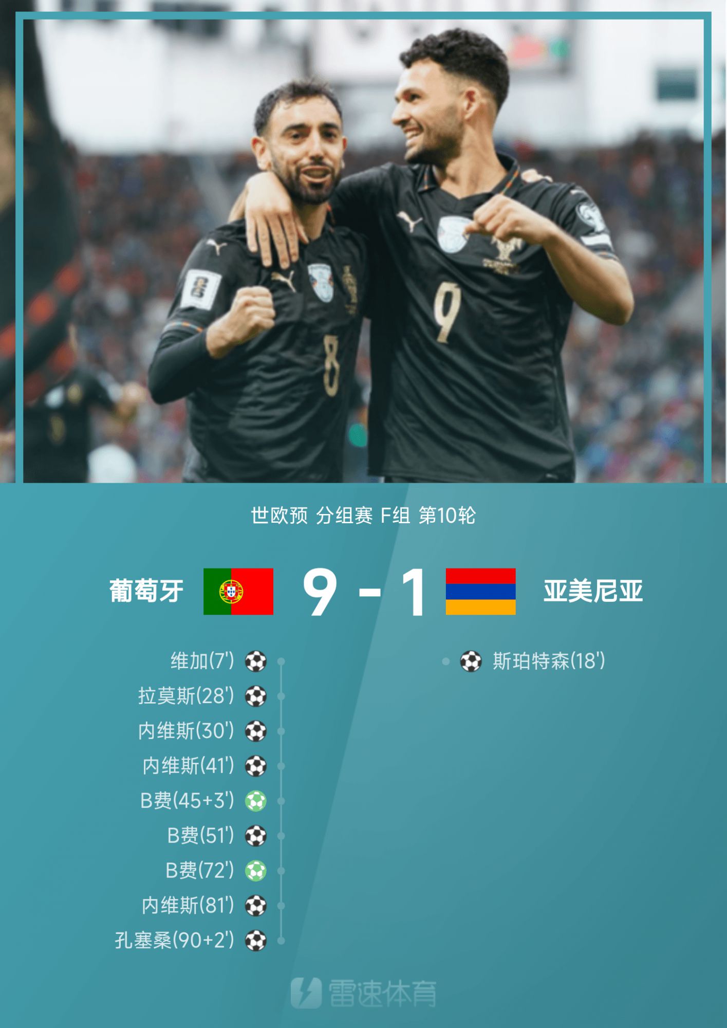 6686 Sports รายงานเมื่อวันที่ 16 พฤศจิกายนว่าในรอบที่ 10 ของกลุ่ม F ของรอบคัดเลือกโลกยุโรปปี 2026 เจ้าบ้านโปรตุเกสเอาชนะอาร์เมเนีย 9-1 เวก้าโจมตีโปรตุเกส จากนั้นสเปิร์ตสันก็ทำคะแนนให้อาร์เมเนียเท่ากัน ในเกมถัดไป ทีมโปรตุเกสเปรียบเสมือนเทพเจ้าแห่งความช่วยเหลือ เนเวสและบีฟีทำแฮตทริกได้ทีละคน รามอสจ่ายบอลและยิง และคอนเซเซาเติมไอซิ่งบนเค้กให้กับทีม โปรตุเกสจบอันดับหนึ่งในกลุ่ม F ด้วย 13 แต้มโดยชนะ 4 เสมอ 1 แพ้ 1 และผ่านเข้ารอบฟุตบอลโลกสหรัฐอเมริกา แคนาดา และเม็กซิโกโดยตรงในปี 2026