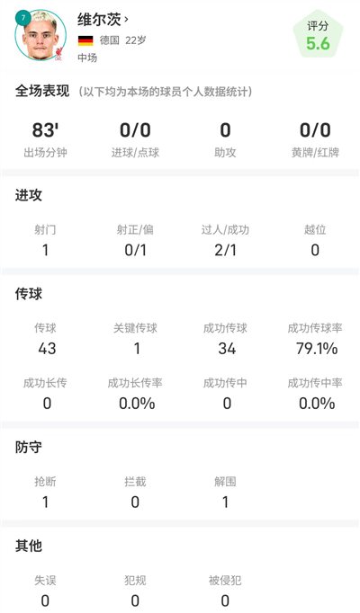สถิติเกมเต็มของเวิร์ตซ์ ทำได้เพียง 1 ประตู 2 เลี้ยงบอล 1 ชัยชนะในการเล่น 83 นาที