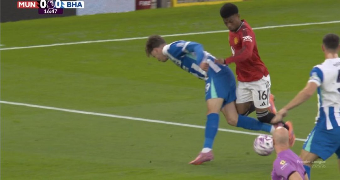 6686 กีฬา วันที่ 26 ตุลาคม พรีเมียร์ลีก รอบ 9 แมนเชสเตอร์ ยูไนเต็ด นำไบรท์ตัน 2-0 ชั่วคราว นาทีที่ 15 ของเกม อมาดบุกเข้าไปในโซนสามวินาที และโดน เด คูเยปเป้ ล้มลง กรรมการไม่ได้ตัดสิน